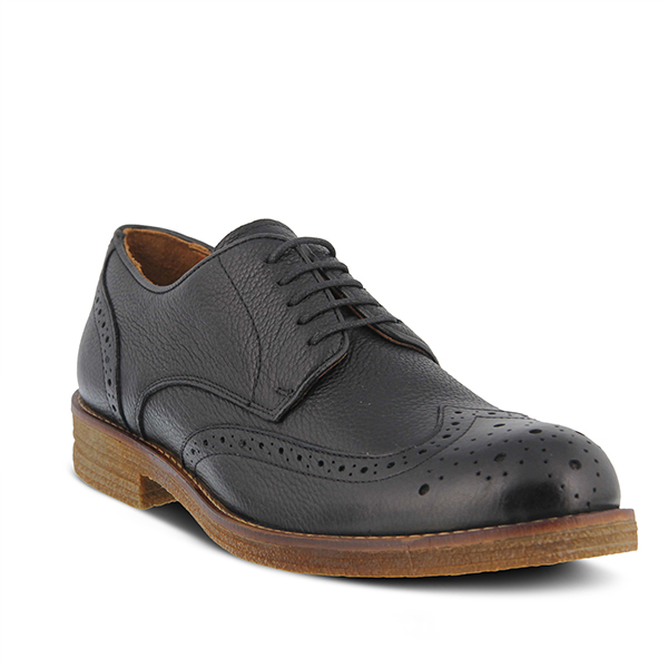 Classic fashionable men's five (5) eyelet leather wing-tip derby brogue with traditional wing cap edge and counter perforating, a durable wax cotton lace and a contrast bound top-line all on a crepe textured quality TPR out-sole with a contrast stitched welt.