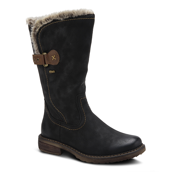 Experience the comfort revolution in this water resistant manmade leather pull-on mid boot featuring a decorative lateral (outside) calf strap and a contrast stitching design all on a chunky and sculpted heel.