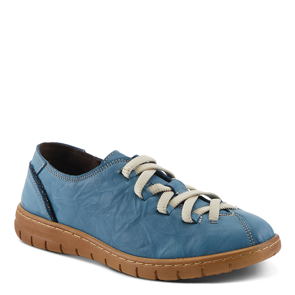 Contemporary high-quality leather sneaker featuring an asymmetrical stitched toe, crinkled leather, and elastic laces on a polyurethane comfort and flexible sole.