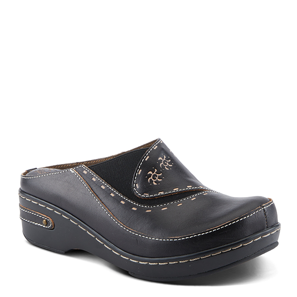 Hand painted, open-back, leather clog with elastic piecing and contrast embossed design.