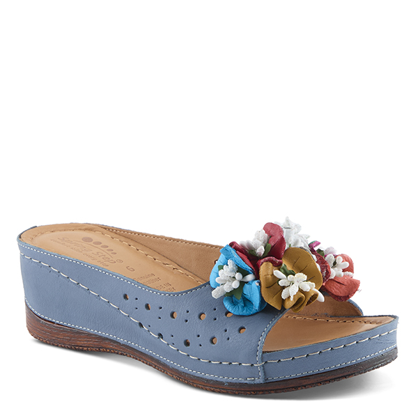 European influenced, high quality premium leather one-piece slide sandal featuring a beautiful multi-color floral applique design, dainty tonal stitchwork, and a circular die-cut pattern for increased breathability and flexibility all on a leather-wrapped, sculpted, chunky, comfort wedge with a platform and flexible forefoot.