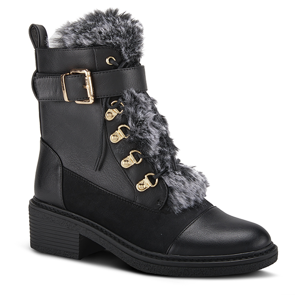 Marvelous lace-up bootie featuring a decorative buckle strap, a pull up tab, gold tone metal hardware and a faux fur covered tongue.