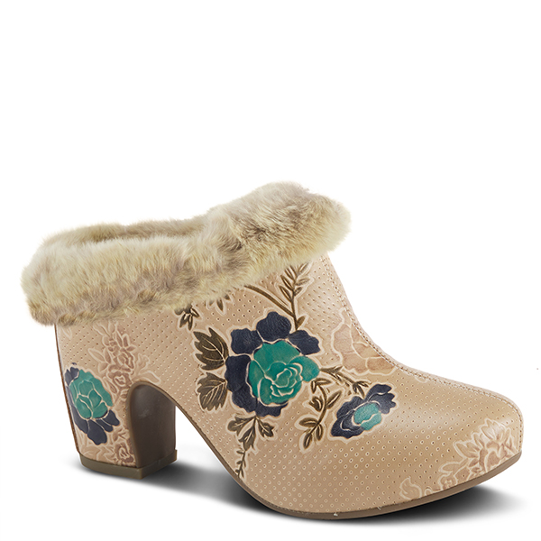 Hand-painted genuine embossed and perforated leather upper clog ornate with beautiful rose design and soft faux fur.