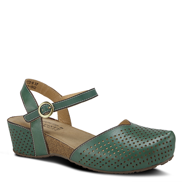 French inspired design, hand painted leather mary-jane perforated clog fashioned with an antiqued metal buckle.