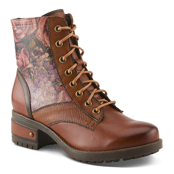 Feminine and floral combat-style leather boot featuring floral printed textile inset, functional lace-up design with eight (8) brushed metal eyelets, and tonal stitch work.