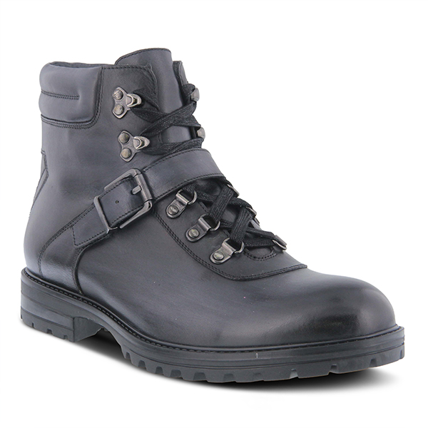 Hiking boot inspired fashionable Men's lace-up padded collar boot, in a character creamed burnished and polished leather, featuring a combination of eyelets, D-Rings, hooks and a wrap around strap which a brushed metal buckle, a great lace up front design, but also with and inside zipper with a brushed metal pull tab.
