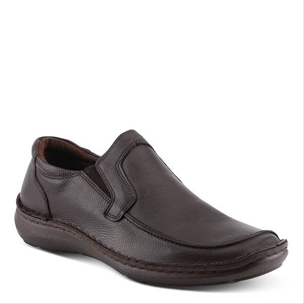Tumbled leather slip-on loafer with elastic side goring and padded collar.