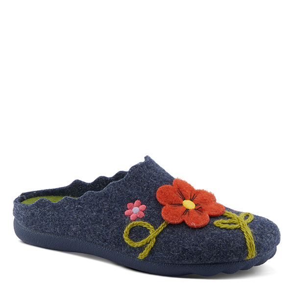 Easy to slip-on indoor/outdoor wool slipper featuring a cheerful wool flower and embroidery.