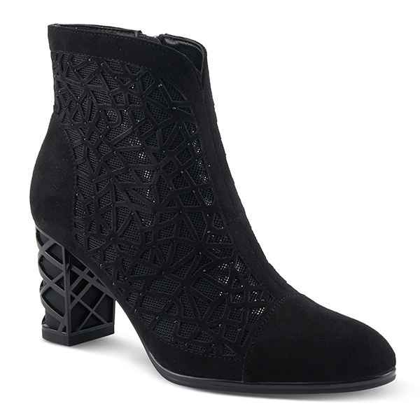 Flaunt your fierce sense of style with the REBELIA. The intricate ultra suede overlay patterned with tonal crystals is made to get you noticed. The mesh shaft keeps your feet cool and comfy for all night wear. Slip these on easily with the convenient inside zipper and make your entrance in the sexy booties featuring a dip in the topline for a peekaboo effect. The bold heel overlay ensures you'll turn heads wherever you go