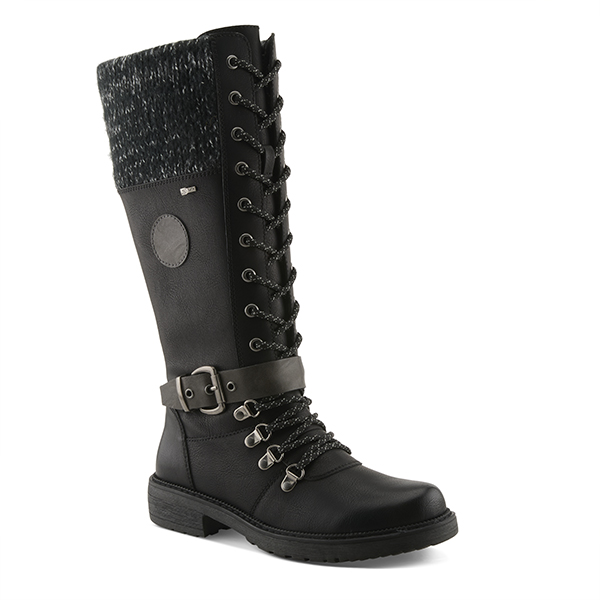 This winter-ready tall boot blends practical comfort with rugged styling. The lace-up front ensures a secure fit, while the knit shaft provides warmth and soft texture for cooler days. Decorative buckle strap and metal hardware add subtle character to the design. Built with a supportive heel and durable outsole, it offers dependable comfort and stability for everyday wear throughout the season.