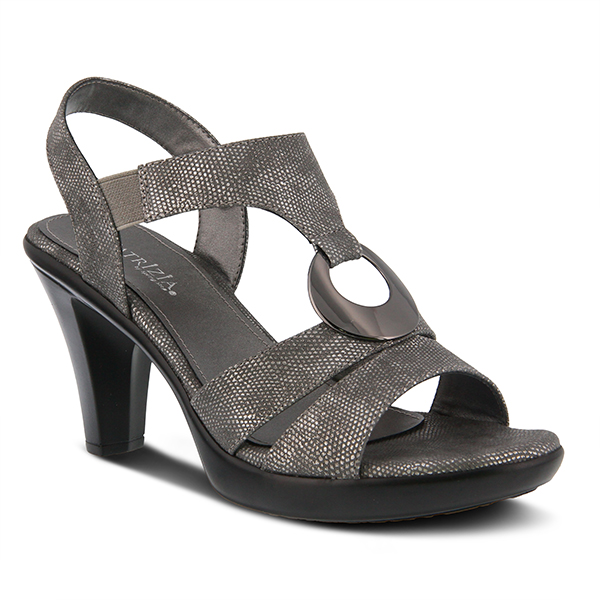 Classic dress sandal featuring a metallic ring ornament and incorporated stretch elastic design.