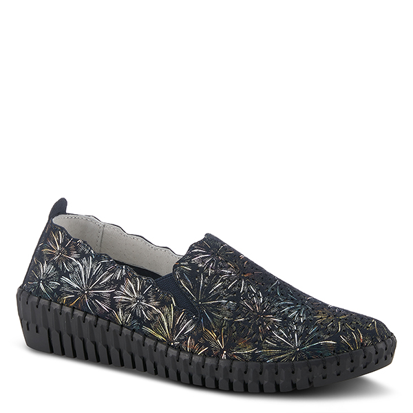 Sporty, high-quality leather sneaker featuring abstract metallic firework-like designs on comfort and flexible stitched sliver wedge.