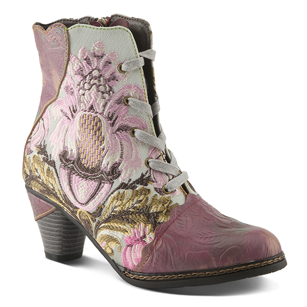 French-inspired premium lace-up bootie featuring embossed leather upper beautifully combined with embroidered textile featuring scalloped edge design and inside zipper on a leather inlay cone heel.