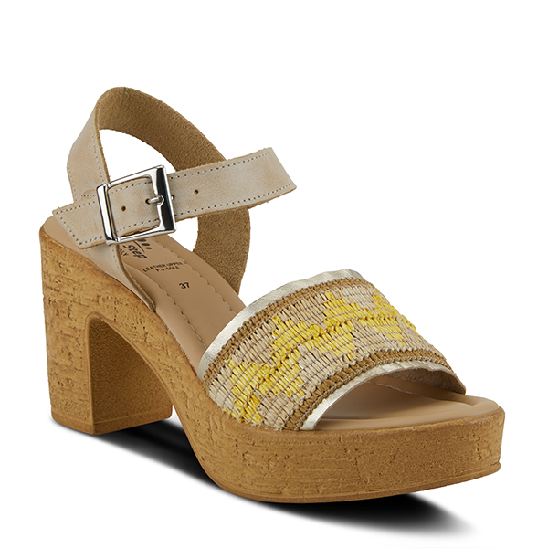 Italian influenced, high quality premium leather quarter strap sandal featuring a beautiful multi color macrame strap across the toes, an adjustable buckle ankle strap with a polished metal buckle and dainty tonal stitchwork all on a cork-inspired, sculpted, comfort heel with a platform.