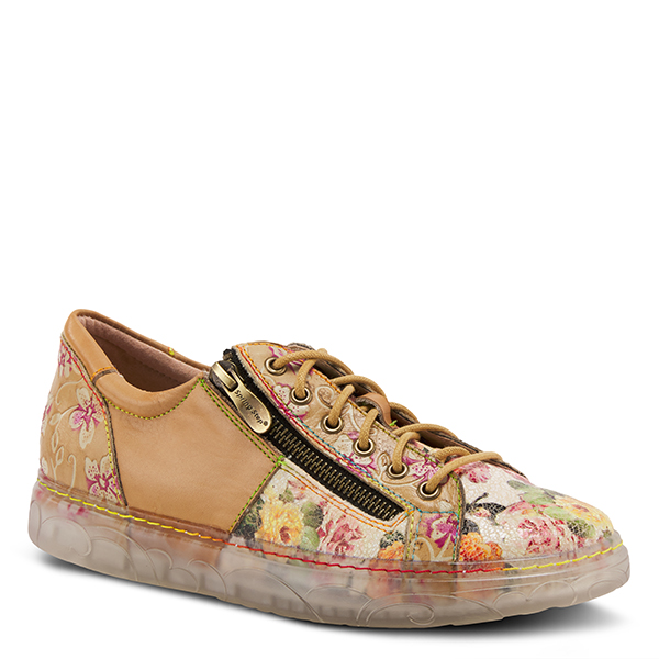 French inspired zippered sneaker like casual, featuring premium leather, both hand-painted and embossed, with botanical printed crackled textile accents. Adjustable metal eyelet lace-up closure with lace keeper, vibrant rainbow stitching, and a super padded comfort collar and removable footbed all on a flat, clear rose embossed sculpted flatform edged in rainbow stitching.