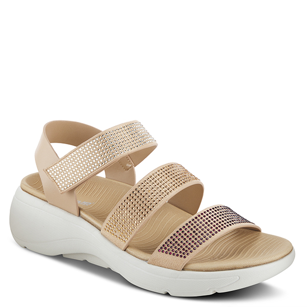 Sporty slip-on sandal with an ajustable ankle strap and two upper straps bedazzled by rhinestones on an anatomic insole and chunky round oustole that is flexible for everyday support.