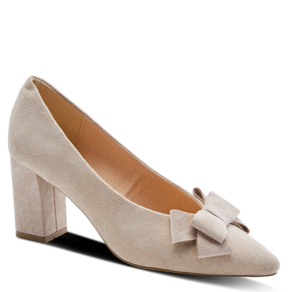 Clean lines and a feminine bow highlight the timeless appeal of this classic pointy toe pump lifted by an on-trend, structural block heel.