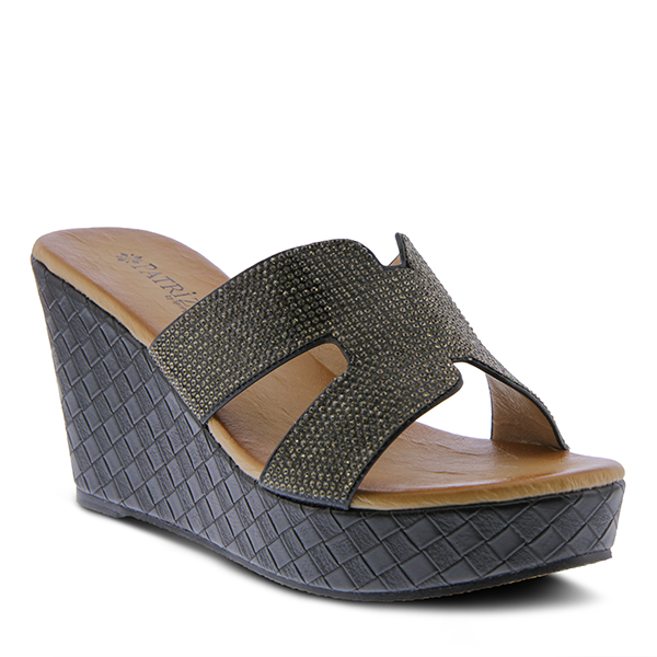Trendy one-piece slide sandal featuring a beautiful all over rhinestone design all on a nature-inspired, matching color-wrapped comfort wedge.